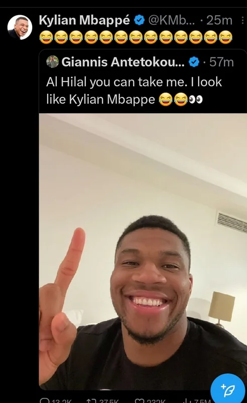 علق الفرنسي كيليان مبابي مهاجم نادي باريس سان جيرمان على تغريدة شبيهه لاعب السلة اليوناني يانيس انتيتكومبو عبر حسابه الشخصي بتويتر بوضعه ايموجي يضحك على تغريدة لاعب السلة.