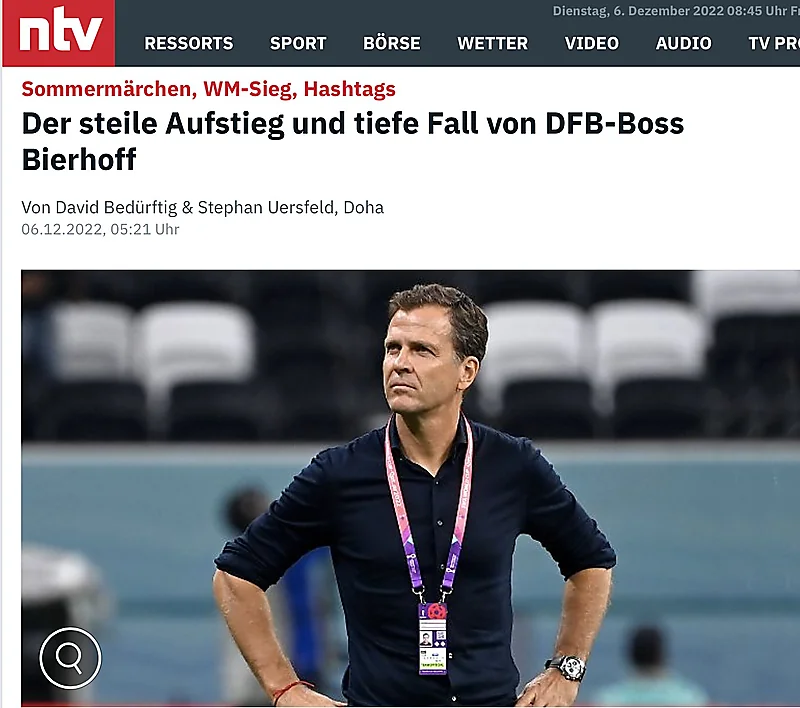 وأشارت تقارير صحفية إلى أن استقالة أوليفر بيرهوف، جاءت بعدما تم تحميله مسؤولية الخروج المبكر لألمانيا للمرة الثانية على التوالي وتم لومه على اختيار شعار "حب واحد" والذي أدى إلى غضب الشعوب العربية من منتخب ألمانيا وأدى إلى انزعاج البلد المضيف قطر من ألمانيا بكأس العالم قطر 2022.