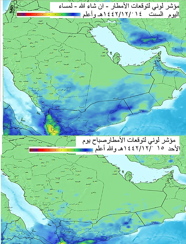 وأضاف الحصيني أن الحالة ستشهدها أيضاً أجزاء من الإمارات وعمان واليمن، مصحوبة برياح متفاوتة على أجزاء من شرق وغرب المملكة.