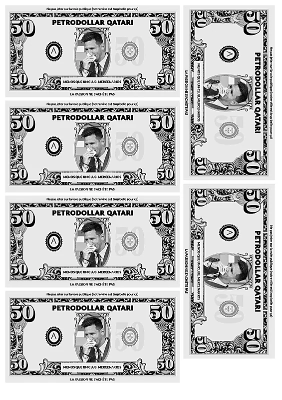 وانتشرت عدة صور للأموال المزيفة التي يعتزمون رميها على "ميسي"، وطبعت على الأموال صورة لـ"ميسي" وهو يبكي، في إشارة إلى أن مالكي باريس سان جيرمان سيدفعوا 110 ملايين يورو كرواتب لميسي.
