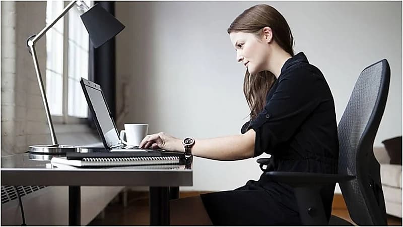 من المريح الاسترخاء وربما الاستلقاء والدوران بالكرسي قليلاً في المكتب. لكن لا ينصح بهذا الوضع وعليك تجربة هذا بدلا منه: اجلسي في مقعدك بالكامل وضعي منشفة صغيرة ملفوفة أو وسادة أسفل الظهر خلف منتصف ظهرك لحماية الانحناء الطبيعي لعمودك الفقري. اثنِي ركبتيك بزاوية قائمة وحافظي على ارتفاعهما أو أعلى قليلًا من وركيك ثم ضعي قدميك بشكل مسطح على الأرض.