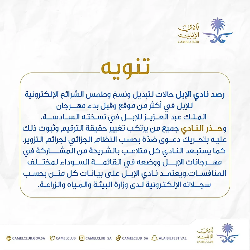 أكد نادي الإبل أنه رصد حالات لتبديل ونسْخ وطمْس الشرائح الإلكترونية للإبل في أكثر من موقع، وقبل بدء مهرجان الملك عبدالعزيز للإبل في نسخته السادسة.